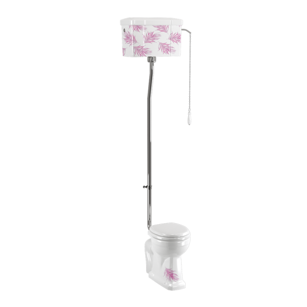 Standarta izmēra tualetes pods ar augstu cisternu, izgatavots pēc pasūtījuma "Botanical Pink" krāsā, ar keramisko cisternu ar vienkāršo skalošanu