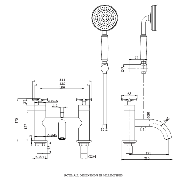 Riviera vannas/dušas maisītājs ar rokas dušu un šļūteni (attālums starp centriem 180 mm)