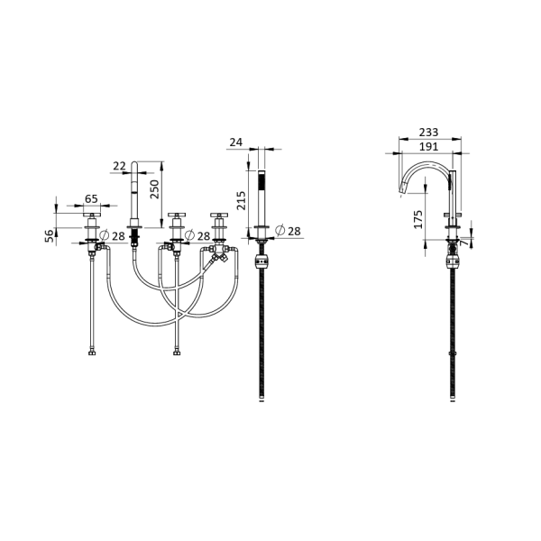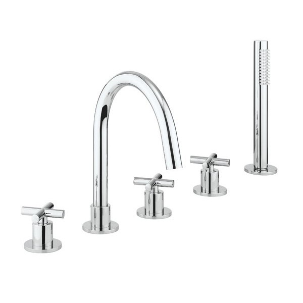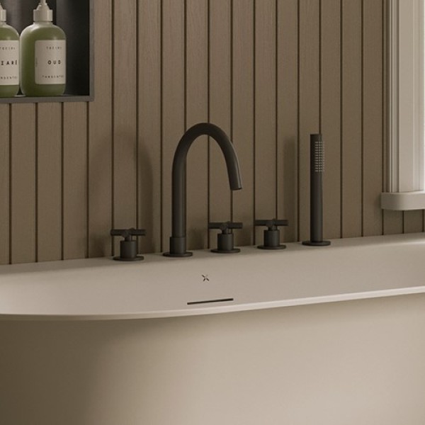 MPRO Crosshead piecu atveru vannas un dušas jaucējkrāns nodrošina visu nepieciešamo izsmalcinātai un ērtai peldes pieredzei, tostarp virsmas montējamu izvelkamu dušas rokturi.